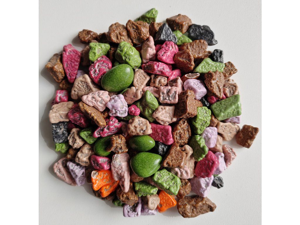 Čokoláda ve tvaru kamínků v barevné polevě.
