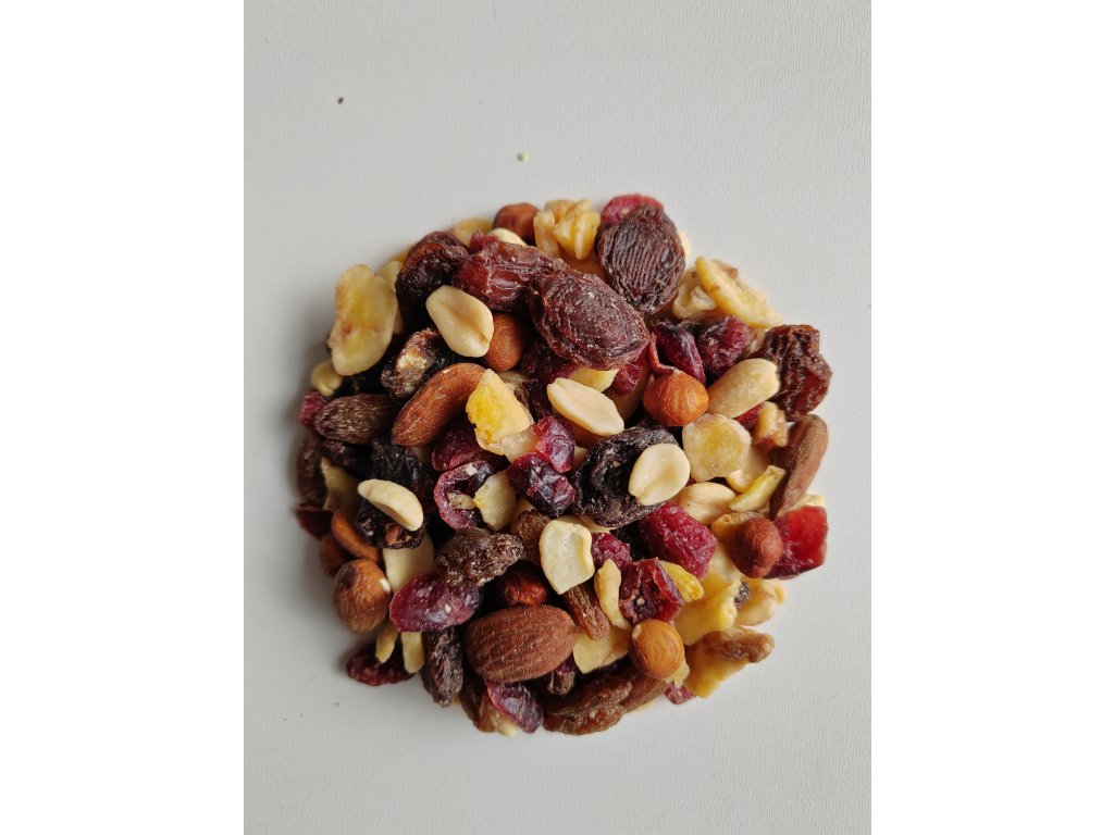 Složení: Lísková jádra, jádra kešu ořechů, jádra mandlí neloupaných, banán chips, brusinky, arašídy loupané pražené nesolené, rozinky.